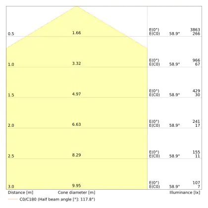 De lichtopbrengst (Lumen), geeft weer hoe krachtig het uitgestraalde licht is. Dit is belangrijk om te weten om de juiste sfeer te creëren. 0 tot 400 Lumen is bij uitstek geschikt voor accent- of sfeerverlichting. Een hoger aantal Lumen is, afhankelijk van de grootte van de ruimte, beter geschikt als ondersteunende- of basisverlichting. Heb je plafonds hoger dan 4 meter, dan is een lichtopbrengst van minimaal 8000lm aan te raden indien heldere verliching gewenst is (vb. in werkomgevingen).
