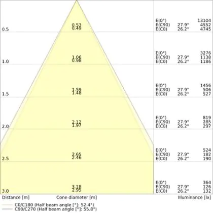 De gradenbundel geeft informatie over hoe breed het licht wordt uitgestraald. Dit zit tussen de 0 en 360 graden (D). Hoe kleiner de hoek, hoe specifieker de lichtbundel is. Over het algemeen is een smalle gradenbundel perfect voor sfeer- of accentverlichting, terwijl een brede gradenbundel ideaal is om grote oppervlaktes te verlichten.