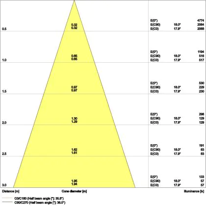 De gradenbundel geeft informatie over hoe breed het licht wordt uitgestraald. Dit zit tussen de 0 en 360 graden (D). Hoe kleiner de hoek, hoe specifieker de lichtbundel is. Over het algemeen is een smalle gradenbundel perfect voor sfeer- of accentverlichting, terwijl een brede gradenbundel ideaal is om grote oppervlaktes te verlichten.